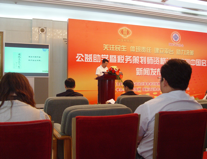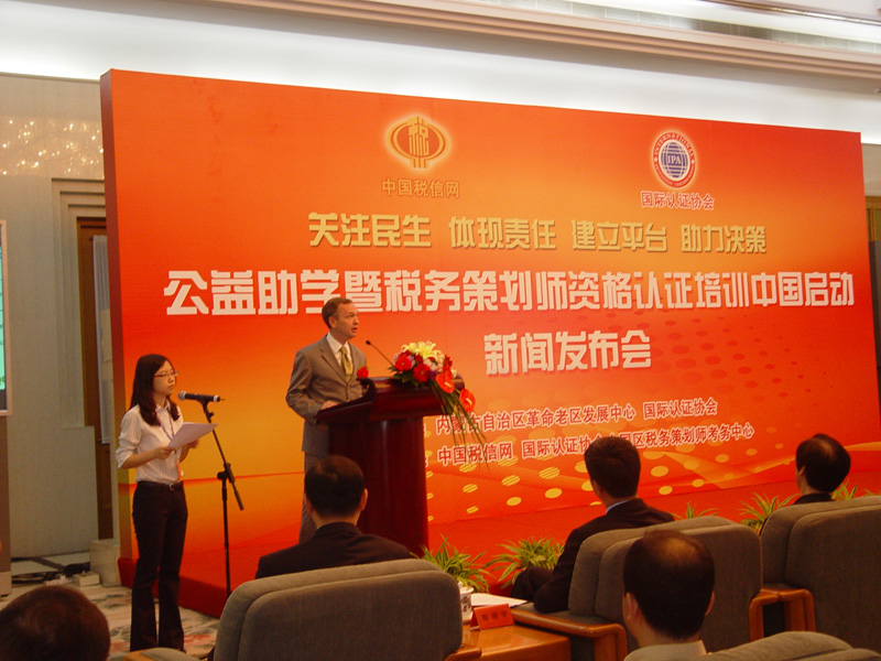 2011年6月16日,国际注册税务筹划师资格认证培训中国启动新闻发布会在北京人民大会堂重庆厅隆重举行,国际认证协会轮值主席Matt Holmes(马修·福尔摩斯)先生、对外贸易部原副部长、中国国际战略学会高级顾问佟志广先生、国家副总督学郭福昌先生、中国高等教育学会副会长、中国教育报刊社原社长党委书记赵书生先生、中国人才研究院副院长王通讯先生、内蒙古自治区革命老区发展中心主任青格勒图先生、中国国际科技促进会信息部彭剑彪主任、国际认证协会中国区首席代表沙江先生、国际认证协会国际注册税务筹划师中国区考务中心主任冯树林先生、安永资深税务合伙人陈明宇先生、中国区税务筹划师考务中心特聘专家代表、国福企业俱乐部、中国区税务筹划师考务中心各地负责人、税务师事务所和企业代表出席了本次新闻发布会,媒体界人士及嘉宾近200人参加了新闻发布会。